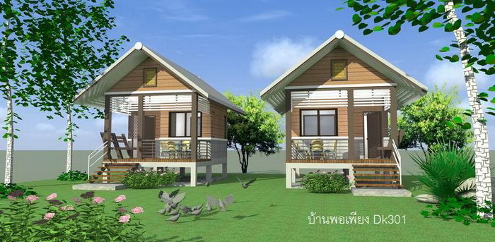 วันนี้โฮมดีดีขอพาเพื่อนๆไปชมแบบบ้านหลังเล็กๆไว้ทำบ้านสวนกันครับ ตัวบ้านออกแบบเป็นสไตล์บ้านสวนรีสอร์ท รูปทรงแบบหลังคาหน้าจั่ว ยกพื้นขึ้นสูงเล็กน้อย ด้านหน้ามีระเบียงบ้านกว้างขวาง และมี 1 ห้องนอน 1 ห้องน้ำ โครงสร้างเป็นคอนกรีตเสริมเหล็กแน่นหนา และผนังบ้านเป็นไม้ผาเทียม สามารถสร้างได้ในงบประมาณ 150,000 บาท ไม่รวมเฟอร์นิเจอร์